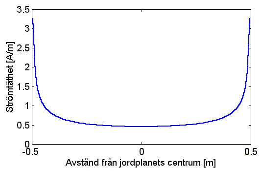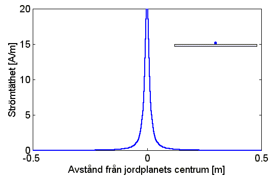 Figur 4, Strömtäthet i jordplanet under en ledare med 1 cm radie på centrumavståndet 1,5 cm.