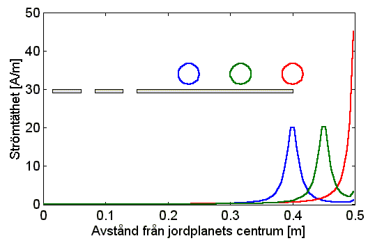 Figur 2, Strömfördelning som induceras i ett jordplan av cirkulära ledare med 0,1 m radie ovanför planet på avstånden 0,15 m (blått), 0,25 m (grönt) och 0,5 m (rött).