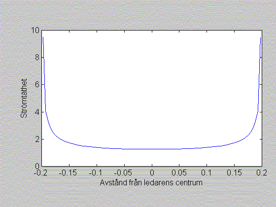 EMCmag2(D,H,B) med lämpliga värden på D, H och B (t ex EMCmag2(0, 0.2, 0.4) ) och du ser strax en kurva som visar strömfördelning i ledaren, de andra kurvorna ligger i fönster bakom, vilka blir synliga när de aktiveras. Nedan visas de kurvor som beräknas med ovanstående exempelkommando.
