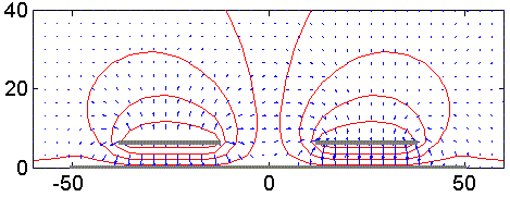 Figur 1. Beräknad fältfördelning omkring två plattledningar, som har potentialerna -V/2 respektive +V/2. Avståndet mellan ledarna är en ledarbredd. I figuren är ledarbredden 25 längdenheter, vilka kan väljas fritt eftersom det bara är förhållandena som bestämmer kapacitansen, men vi antar här 25 mm. Elektriskt fält med blå pilar ser en aning osymmetriskt ut eftersom pilarna visar fältstyrkan vid pilarnas fotpunkt. Röda kurvor är ekvipotentiallinjer. Kapacitansen mellan ledarna är 13,8 pF/m.