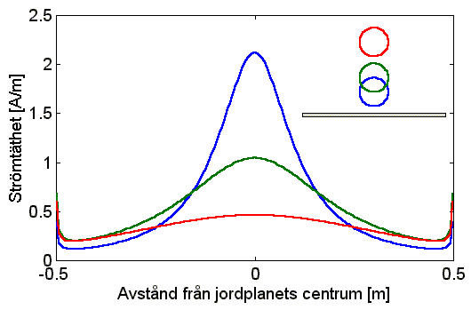 Figur 2, Strömfördelning som induceras i ett jordplan av cirkulära ledare med 0,1 m radie ovanför planet på avstånden 0,15 m (blått), 0,25 m (grönt) och 0,5 m (rött).
