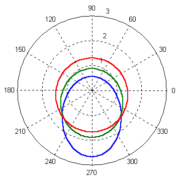 Figur 3, Strömfördelning runt ledare med 0,1 m radie på olika avstånd över jordplan. Blå kurva för centrumavstånd 0,15 m, grön för 0,25 m och röd för 0,5 m.