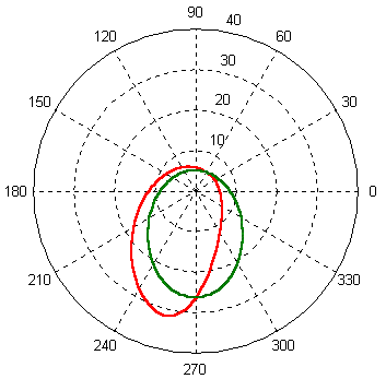 Figur 7, Strömfördelning runt ledare med 1 cm radie på centrumavstånd 1,5 cm från ett jordplan nära dess kant. Röd kurva gäller för ledare precis ovanför kanten och grön kurva för ledare på 5 cm in från kanten.