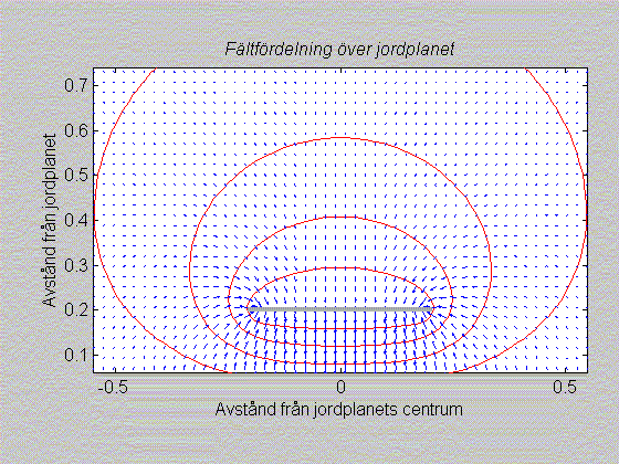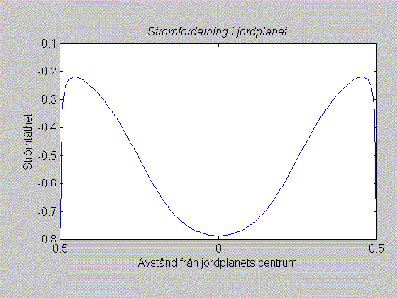 Detta program levererar tre figurer vid varje körning, en som visar strömfördelning i jordplanet och en som visar strömfördelning runt ledaren och en som visar fältstyrkan.
