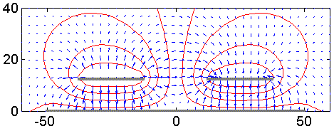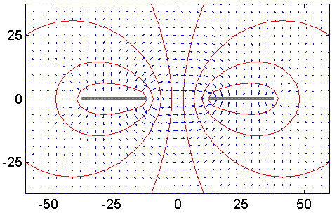 Figur 1. Beräknad fältfördelning omkring två plattledningar, som har potentialerna -V/2 respektive +V/2. Avståndet mellan ledarna är en ledarbredd. I figuren är ledarbredden 25 längdenheter, vilka kan väljas fritt eftersom det bara är förhållandena som bestämmer kapacitansen, men vi antar här 25 mm. Elektriskt fält med blå pilar ser en aning osymmetriskt ut eftersom pilarna visar fältstyrkan vid pilarnas fotpunkt. Röda kurvor är ekvipotentiallinjer. Kapacitansen mellan ledarna är 13,8 pF/m.