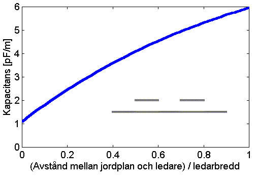 Figur 4. Delkapacitans mellan två plattledningar på olika avstånd från ett jordplan. Plattledningarna är lika och befinner sig på ett avstånd från varandra lika med bredden, se skiss i figuren. Avståndet varierar mellan nästan 0 och en ledningsbredd. Kapacitansen minskar när ledarna närmar sig jordplanet och går mot 1 pF för mycket små avstånd.